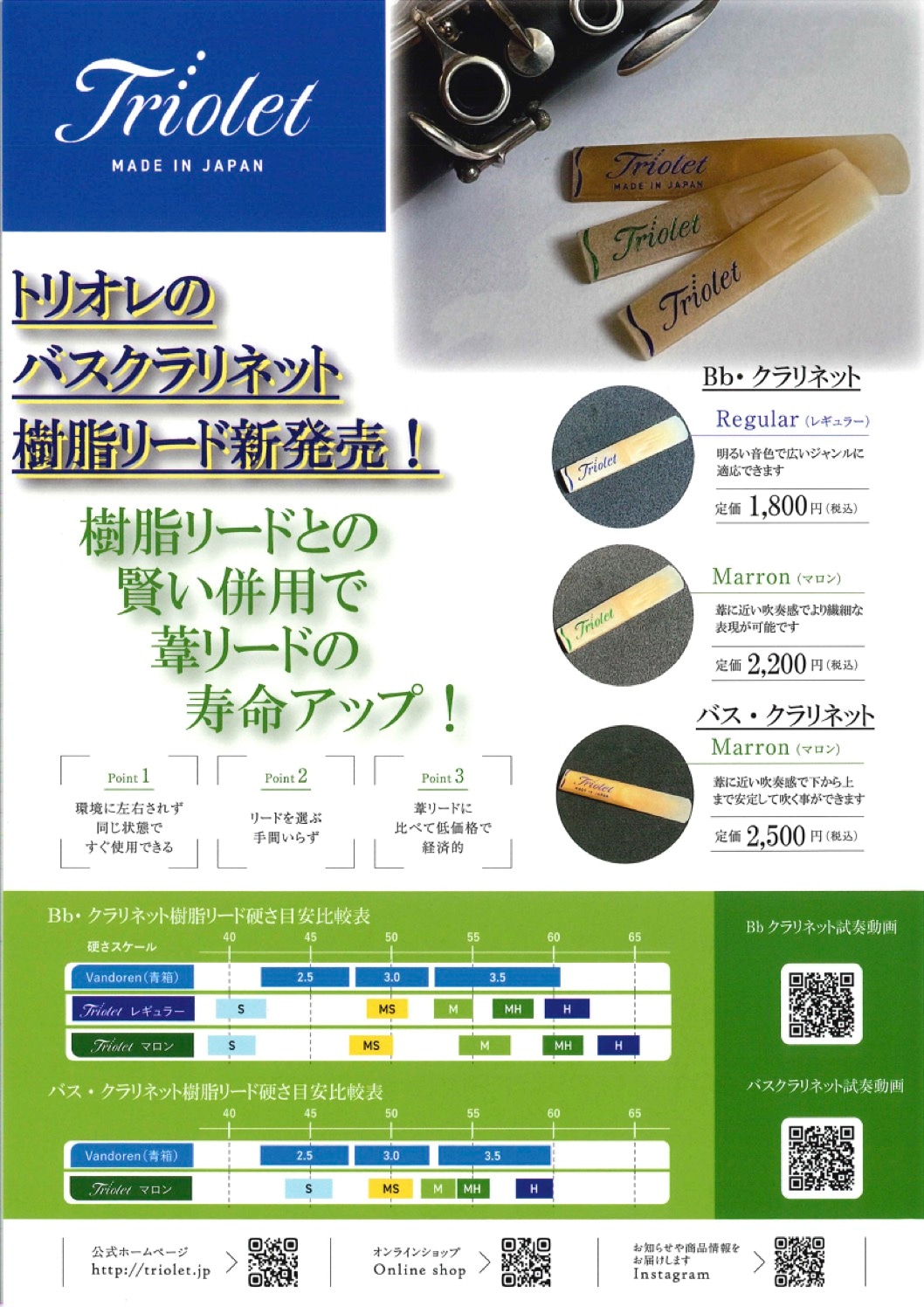 トリオレは『ふくよかな音色で倍音を多く含み、遠鳴りする音』を目標とし、材料や形状、製造プロセスにこだわってリードの開発をしています。そうして開発されたこのリードは、音の立ち上がりが良いことから安定した演奏をサポートします。そして、樹脂リード普及のためにお求めやすい価格としています。